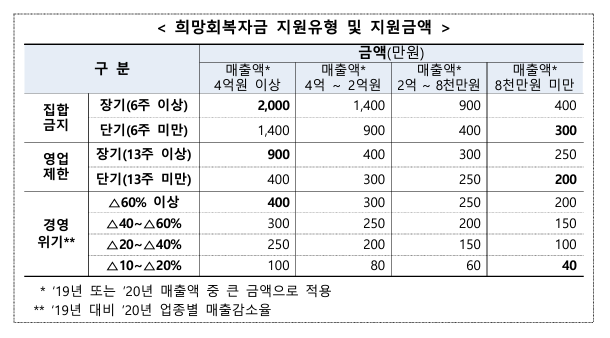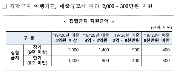 집합금지 이행기간 및 매출규모에 따라 2,000~300만원이 지원됩니다.