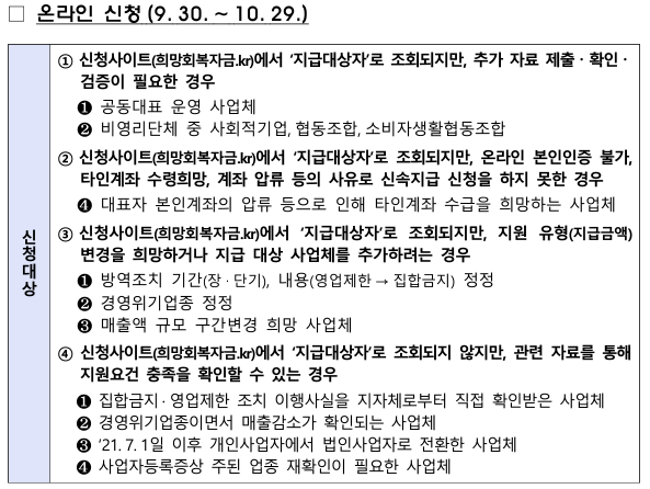 - 온라인 문의 : 홈페이지(희망회복자금.kr)이나 온라인 채팅상담 (평일 09~20시)