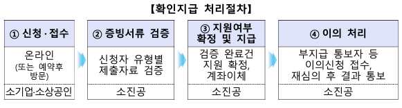 증빙 서류를 온라인으로 제출후 소상공인시장진흥공단에서 확인 후 검증을 통해 지급 여부가 정해집니다.