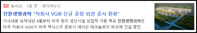 기사내용 요약내년 4월부터 미국 현지 생산시설 상업적 가동 목표 진원생명과학은 미국 자회사 VGXI가 미국 텍사스주 콘로시 데이슨 테크놀로지 파크에 건설 중인...