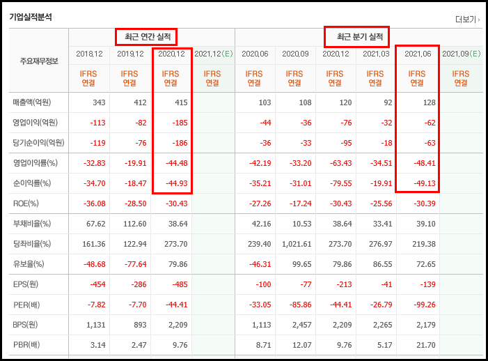 최근 연간 실적을 보면 2020년 12월 매출액은 415억원이고 영업이익은 -185억원 당기순이익은 -186억원입니다.
