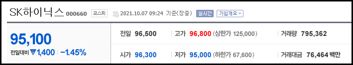 2021년 10월 7일 SK하이닉스의 주가는 전일 대비 -1.45% 하락한 95,100원에 거래되었습니다.