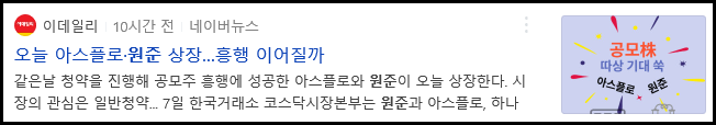 같은날 청약을 진행해 공모주 흥행에 성공한 아스플로와 원준이 오늘 상장한다. 시장의 관심은 일반청약... 7일 한국거래소 코스닥시장본부는 원준과 아스플로, 하나금융스팩...