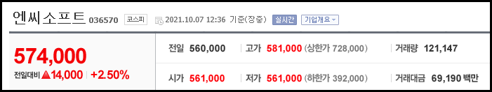 2021년 10월 7일 엔씨소프트의 주가는 상향세를 타고 있습니다.