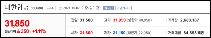 2021년 10월 7일 대한항공 시세를 살펴보면 전일대비 1.11% 상승한 31,850원으로 장마감하였습니다.