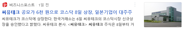 씨유테크 공모가 6천 원으로 코스닥 8일 상장, 일본기업이 대주주