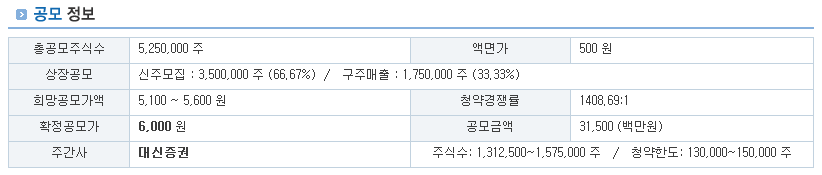 확정 고모가는 6,000원 공모금액은 315억원입니다.