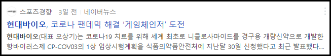 10월 1일 현대바이오는 신종 코로나바이러스 감염증(코로나19) 치료를 위해 니클로사마이드를 경구용 개량신약으로 개발한 항바이러스제 'CP-COV03'의 1상 임상시험계획을 식품의약품안전처에 신청한 바 있습니다.