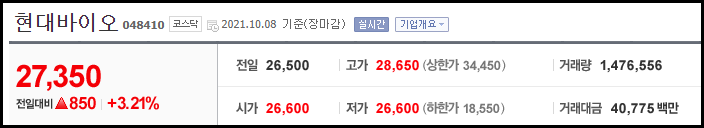 2021년 10월 8일 기준으로 현대바이오는 전일대비 3.21% 하락한 27,350원에 장마감하였습니다.