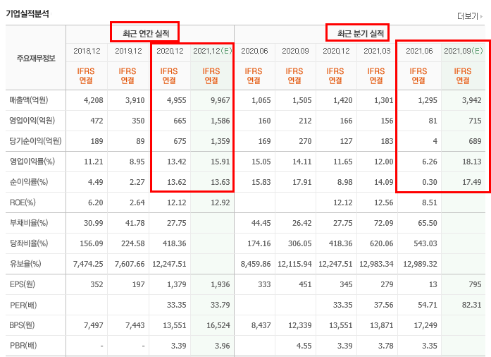 2021년 예상 매출액은 9,967억원 영업이익 1,586억원 당기순이익 1,359억원입니다.