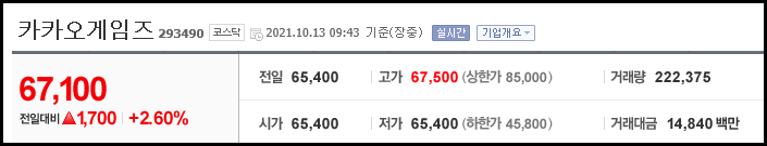 2021년 10월 13일 오전 9시 43분 기준으로 카카오게임즈는 전일대비 2.6%가 오른 67,100원에 거래되고 있습니다.