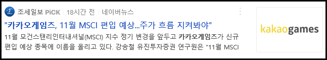 11월 모건스탠리인터내셔널(MSCI) 지수 정기 변경을 앞두고 카카오게임즈가 신규 편입 예상 종목에 이름을 올리고 있다. 강송철 유진투자증권 연구원은 "11월 MSCI ...