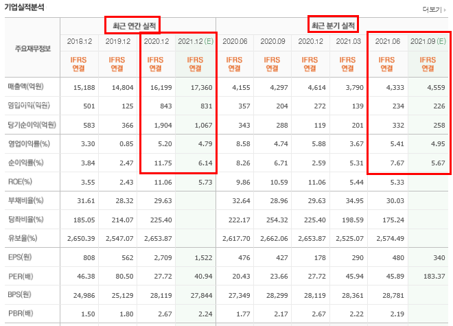 2021년 올해 예상 매출액은 1조 7,360억원 영업이익은 831억원 당기순이익은 1,067억원입니다.