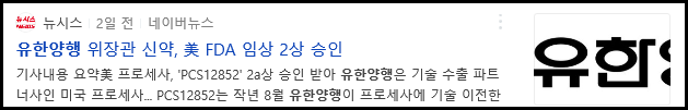 기사내용 요약美 프로세사, 'PCS12852' 2a상 승인 받아 유한양행은 기술 수출 파트너사인 미국 프로세사... PCS12852는 작년 8월 유한양행이 프로세사에 기술 이전한 ...