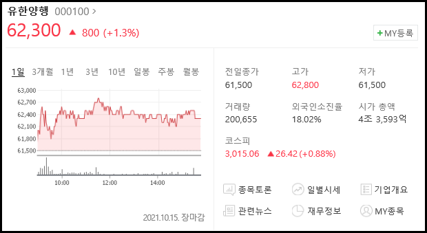 2021년 10월 15일 유한양행 주가는 전일대비 1.3% 상승한 62,300원에 장마감하였습니다.