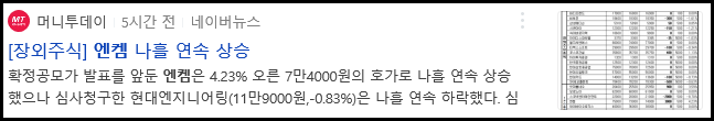 확정공모가 발표를 앞둔 엔켐은 4.23% 오른 7만4000원의 호가로 나흘 연속 상승했으나 심사청구한 현대엔지니어링(11만9000원,-0.83%)은 나흘 연속 하락했다. 심사승인된...