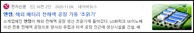 소재업체인 엔켐이 해외 전해액 공장 생산 초읽기에 들어갔다. LG화학과 SK이노베이션 전용 전해액 공장으로 양사의 유럽과 미국 공장 인근에 생산시설을 건설, 배터리 ...