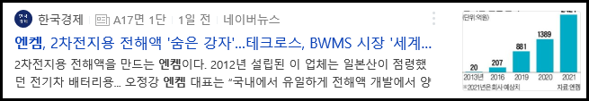 2차전지용 전해액을 만드는 엔켐이다. 2012년 설립된 이 업체는 일본산이 점령했던 전기차 배터리용... 오정강 엔켐 대표는 “국내에서 유일하게 전해액 개발에서 양산까지 ...