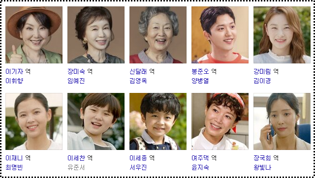 | 이휘향(이기자 역) / 임예진(장미숙 역) / 김영옥(신달래 역) / 양병열(봉준오 역) / 김이경(강미림 역) / 최명빈(이재니 역) / 유준서(이세찬 역) / 서우진(이세종 역) / 윤지숙(여주댁 역) / 왕빛나(장국희 역) |