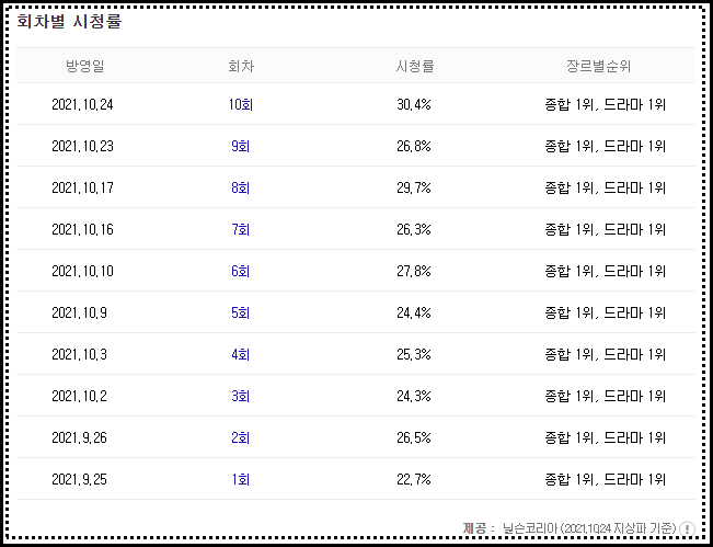 | 2021.10.24 10회 30.4% 종합 1위, 드라마 1위 2021.10.23 9회 26.8% 종합 1위, 드라마 1위 2021.10.17 8회 29.7% 종합 1위, 드라마 1위 2021.10.16 7회 26.3% 종합 1위, 드라마 1위 2021.10.10 6회 27.8% 종합 1위, 드라마 1위 2021.10.9 5회 24.4% 종합 1위, 드라마 1위 2021.10.3 4회 25.3% 종합 1위, 드라마 1위 2021.10.2 3회 24.3% 종합 1위, 드라마 1위 2021.9.26 2회 26.5% 종합 1위, 드라마 1위 2021.9.25 1회 22.7% 종합 1위, 드라마 1위 |