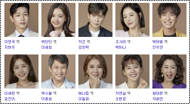 | 지현우(이영국 역) / 이세희(박단단 역) / 강은탁(차건 역) / 박하나(조사라 역) / 안우연(박대범 역) / 윤진이(이세련 역) / 이종원(박수철 역) / 이일화(애나킴 역) / 오현경(차연실 역) / 차화연(왕대란 역) |