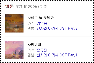 | 신사와 아가씨 음악듣기 ost 사랑은 늘 도망가 임영웅 사랑이야 송유진 눈부신 기억 홍대광 (0) | 2021.11.13 |