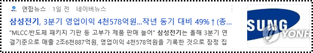 기사내용 요약"내년 고온·고압 고부가 전장용 MLCC 제품 확대" 삼성전기는 27일 3분기(7~9월) 실적발표 컨퍼런스콜에서 "4분기 실적은 3분기보다 감소할 것으로 보이지만...