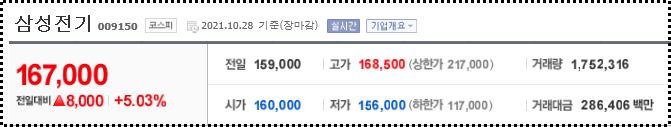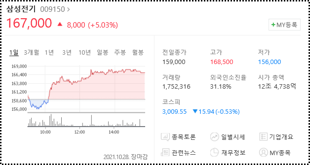 2021년 10월 28일 삼성전기는 전일대비 5.03%가 상승한 167,000원에 장마감하였습니다.이는 전일대비 8,000원이 상승한 수치입니다.이 날 시가는 160,000원에 시작하였고 고가는 168,500원 저가는 156,000원입니다.거래량은 1,752,316 거래대금은 2,864억 6백만원입니다.