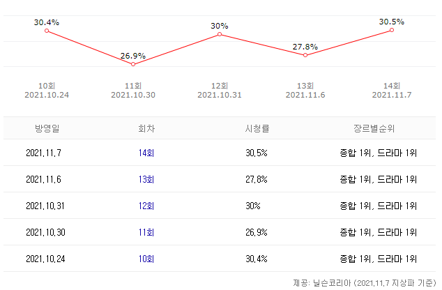 지난 11월 7일에 방송된 신사와 아가씨 14회의 시청률은 30.5%를 기록했습니다.