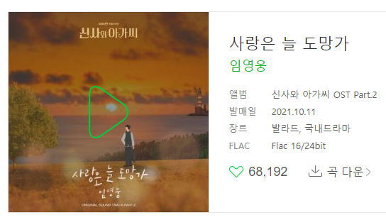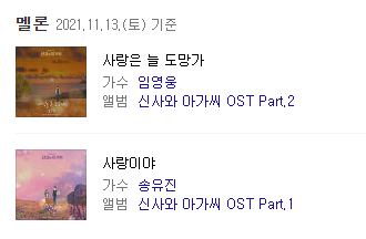 신사와 아가씨 음악 ost 사랑은 늘 도망가 임영웅 사랑이야 송유진 눈부신 기억 홍대광 정보 입니다.