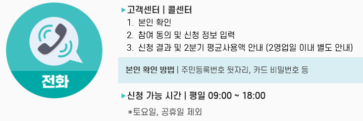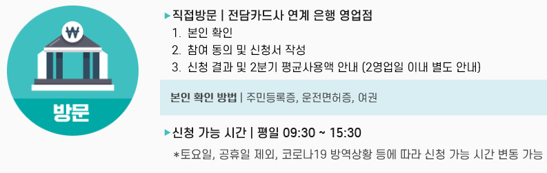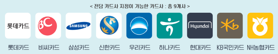 전담카드사는 롯데카드, 비씨카드, 삼성카드, 신한카드, 우리카드, 하나카드, 현대카드, KB국민카드, NH농협카드 총 9개 카드사가 참여신청 접수할 수 있습니다.
