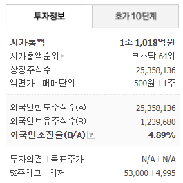 52주 최고가는 53,000원 52주 최저가는 4,995원입니다.