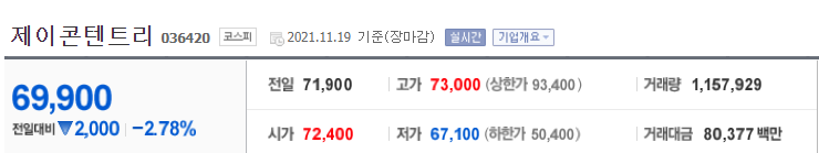제이콘텐트리의 주가는 2021년 11월 19일 기준으로 69,900원에 장마감하였습니다.