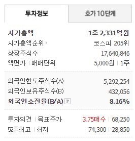 외국인한도 주식수는 25,358,136 외국인 보유 주식수는 1,239,680으로 외국인소진율은 4.89% 입니다.