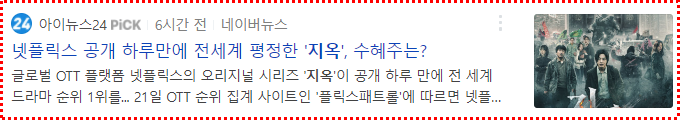 글로벌 OTT 플랫폼 넷플릭스의 오리지널 시리즈 '지옥'이 공개 하루 만에 전 세계 드라마 순위 1위를... 21일 OTT 순위 집계 사이트인 '플릭스패트롤'에 따르면 넷플...
