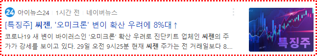 코로나19 새로운 변종인 '오미크론' 등장으로 진단키트에 대한 수요가 크게 증가할 것으로 예상되며 씨젠(096530) 주가가 강세를 보이고 있다. 29일 '코로나19(진단키트)' 관련 종목들이 강세를 보이는 가운데, 씨젠도...