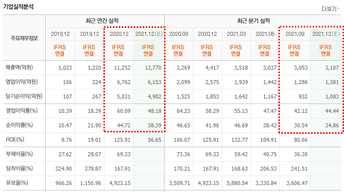 2021년 4분기 예상 실적을 살펴보면 매출액은 2,107억원 영업이익은 1,381억원, 당기순이익은 1,083억원을 예상하고 있습니다.