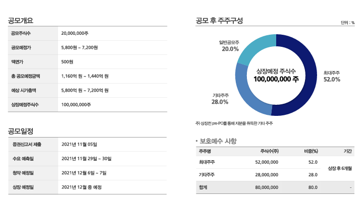 청약일 : 21. 12. 06(월) ~ 12. 07(화) 환불일 : 21. 12. 09(목) 상장예정일 : 21. 12. 16 (목) 희망공모가 : 5,800원 총공모주식수 20,000,000주 일반청약주식수 5,000,000~6,000,000 주 |